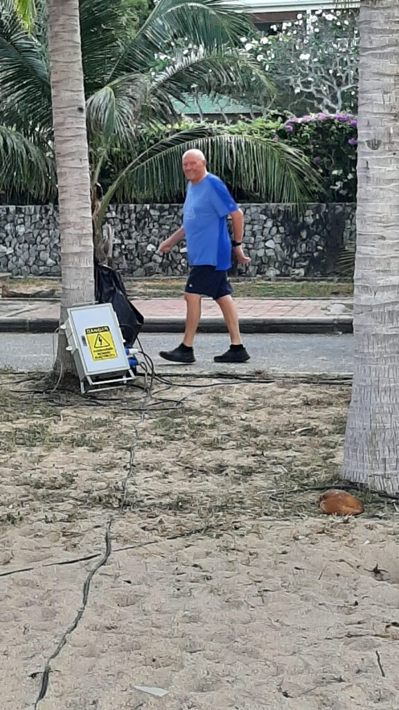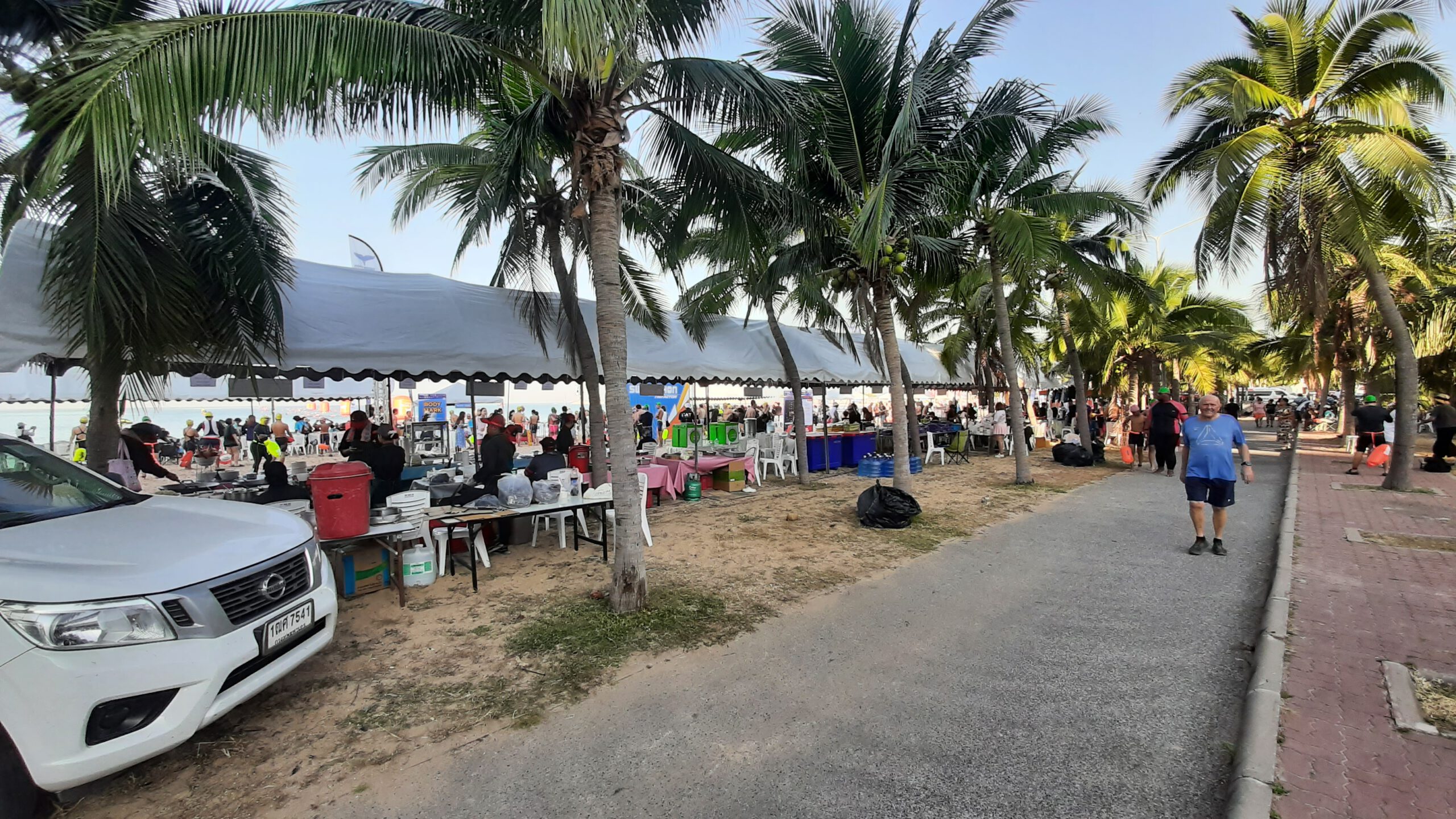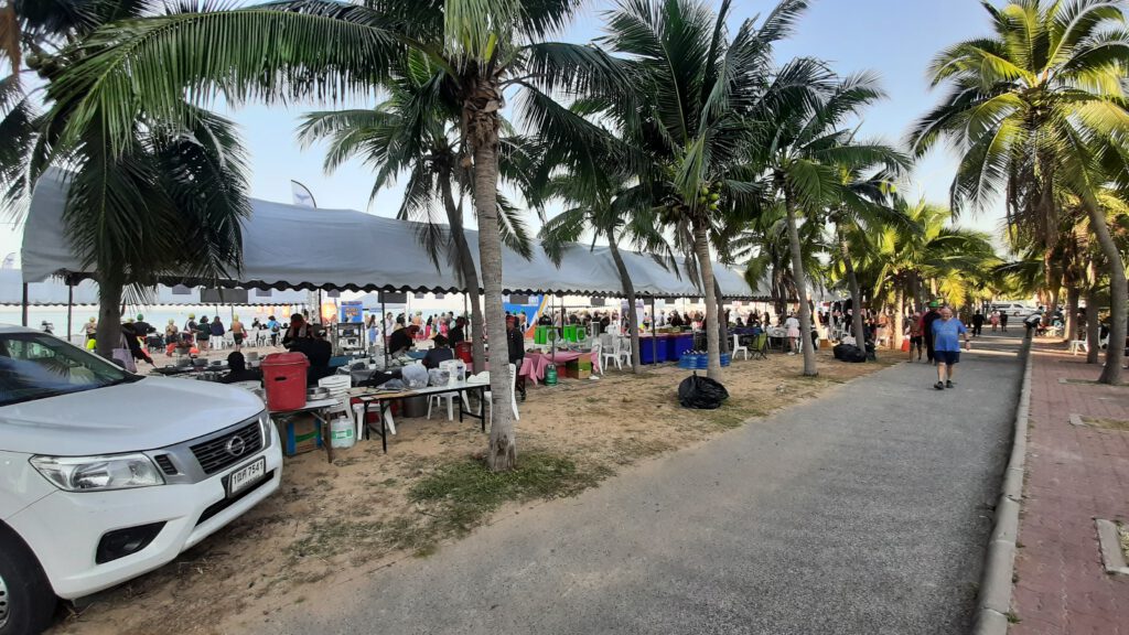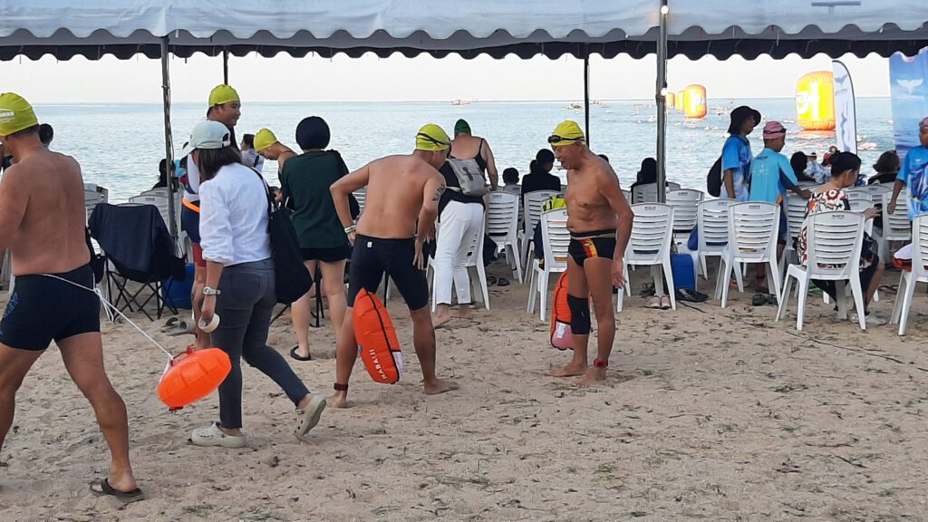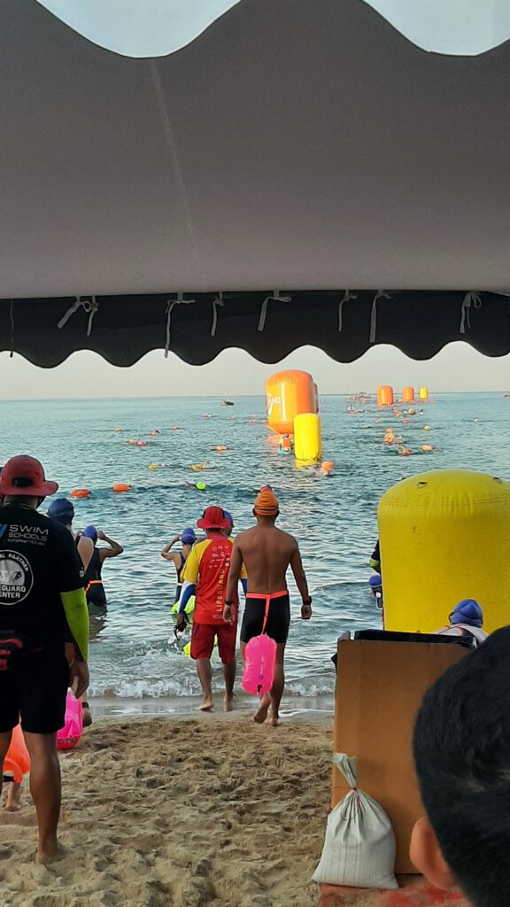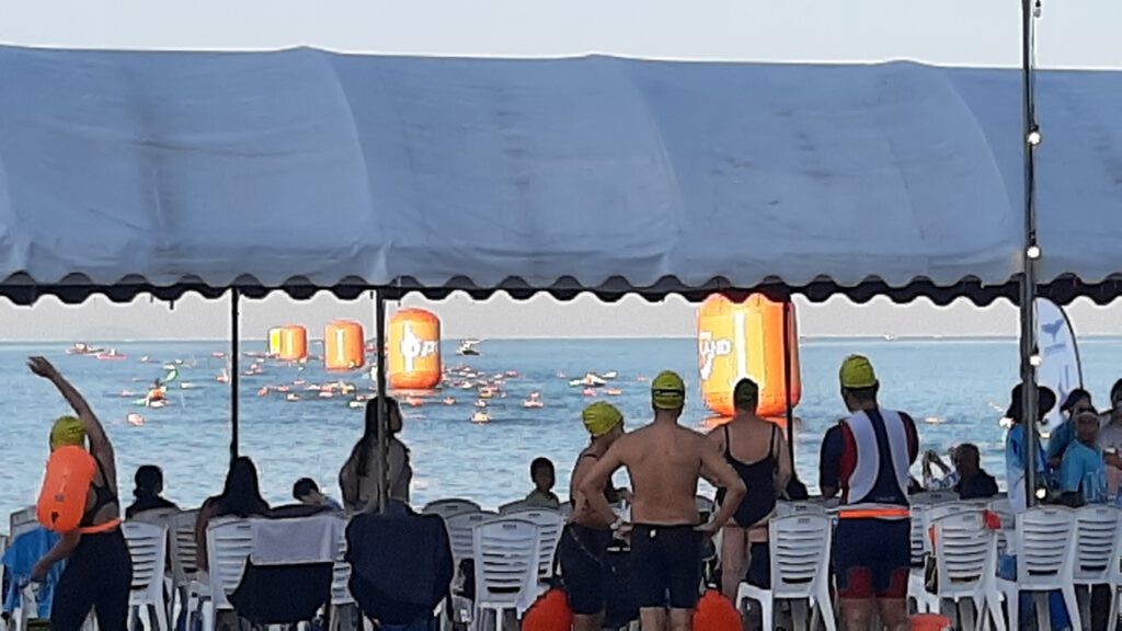 En al vele weken vooruit is dat in Thailand overal zichtbaar. de shopping-malls zijn weelderig voorzien van kerst attributen en overal zie je de verlichting weldadig branden. Hier in Baan Somprasong is zelfs afgekondigd dat er tussen 20 december en 7 januari niet mag worden geklust en geen lawaai mag worden gemaakt… !!! Tja geweldig een paar dagen dus rust….denk je dan. Maar van de week werd het strand hier voor Baan Somprasong ingenomen door een groot aantal tenten, podia en een grote hoeveelheid luidsprekers. En ja hoor dit hele weekend is er een internationale zwemmarathon hier zo vlak voor de deur. Honderden zwemmers gaan het komende weekend verschillende afstanden zwemmen en er worden natuurlijk weer heel veel toeschouwers verwacht.