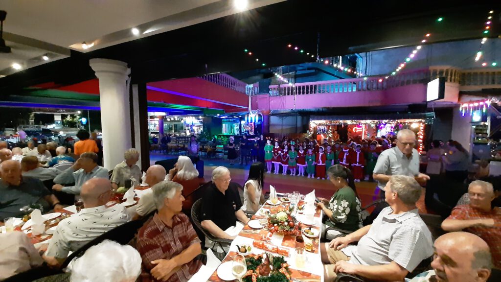 Afgelopen donderdagavond hebben we hier al het jaarlijkse kerstdiner gehad en dat was weer geweldig georganiseerd en erg lekker eten. Het hele restaurant is dan afgehuurd door de Nederlandse vereniging en je zit dan samen met alleen Nederlandse mensen , sommige natuurlijk met aanhang , aan tafel. Omdat we met de NVTP (Nederlandse Vereniging Thailand ( afdeling Pattaya) al druk bezig zijn om in het kindertehuis van Child Protection and Development Center (CPDC) te Hua Yai een uitbereiding te realiseren van het aantal zonnepanelen werd ook deze avond aangegrepen om even met de pet rond te gaan. En heel erg leuk was dat een grote groep kinderen voor ons een aantal kerstliedjes kwam zingen.