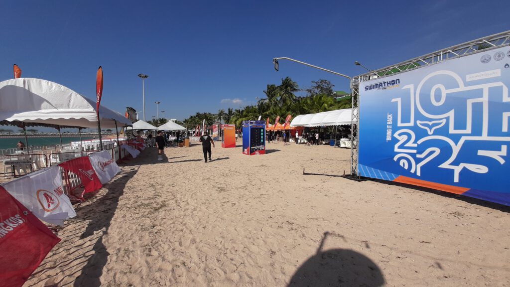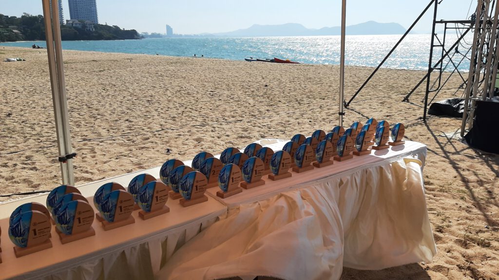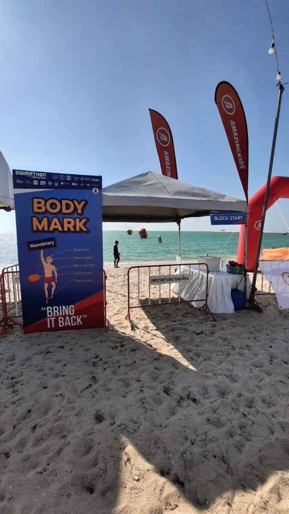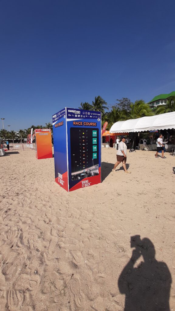 En al vele weken vooruit is dat in Thailand overal zichtbaar. de shopping-malls zijn weelderig voorzien van kerst attributen en overal zie je de verlichting weldadig branden. Hier in Baan Somprasong is zelfs afgekondigd dat er tussen 20 december en 7 januari niet mag worden geklust en geen lawaai mag worden gemaakt… !!! Tja geweldig een paar dagen dus rust….denk je dan. Maar van de week werd het strand hier voor Baan Somprasong ingenomen door een groot aantal tenten, podia en een grote hoeveelheid luidsprekers. En ja hoor dit hele weekend is er een internationale zwemmarathon hier zo vlak voor de deur. Honderden zwemmers gaan het komende weekend verschillende afstanden zwemmen en er worden natuurlijk weer heel veel toeschouwers verwacht.