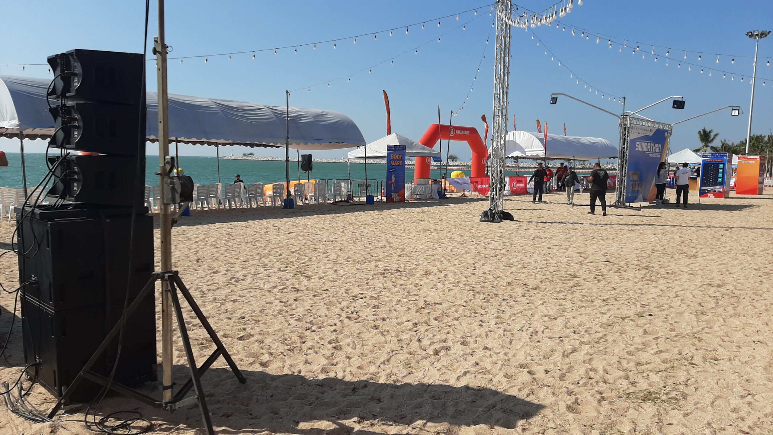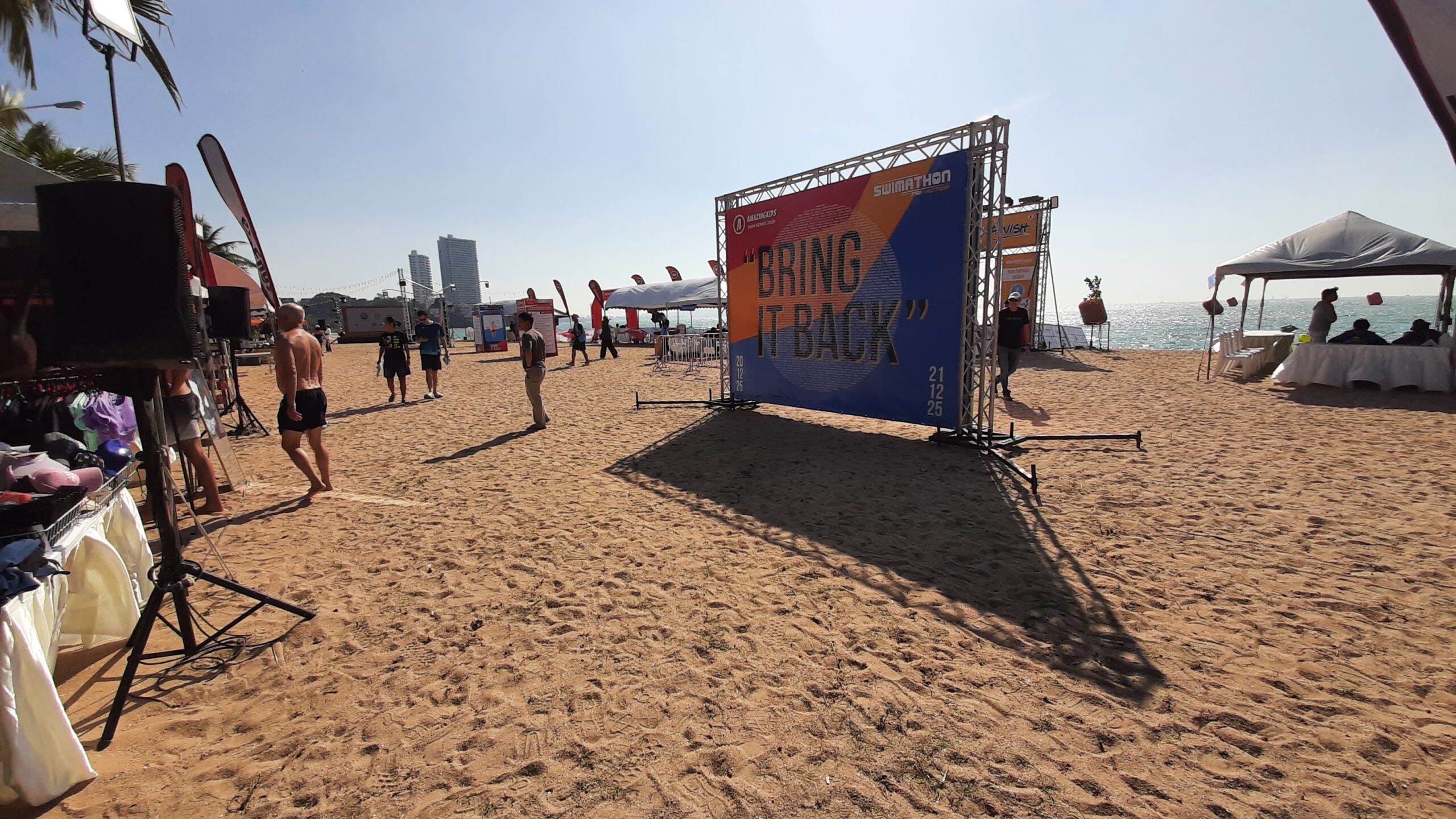 En al vele weken vooruit is dat in Thailand overal zichtbaar. de shopping-malls zijn weelderig voorzien van kerst attributen en overal zie je de verlichting weldadig branden. Hier in Baan Somprasong is zelfs afgekondigd dat er tussen 20 december en 7 januari niet mag worden geklust en geen lawaai mag worden gemaakt… !!! Tja geweldig een paar dagen dus rust….denk je dan. Maar van de week werd het strand hier voor Baan Somprasong ingenomen door een groot aantal tenten, podia en een grote hoeveelheid luidsprekers. En ja hoor dit hele weekend is er een internationale zwemmarathon hier zo vlak voor de deur. Honderden zwemmers gaan het komende weekend verschillende afstanden zwemmen en er worden natuurlijk weer heel veel toeschouwers verwacht.